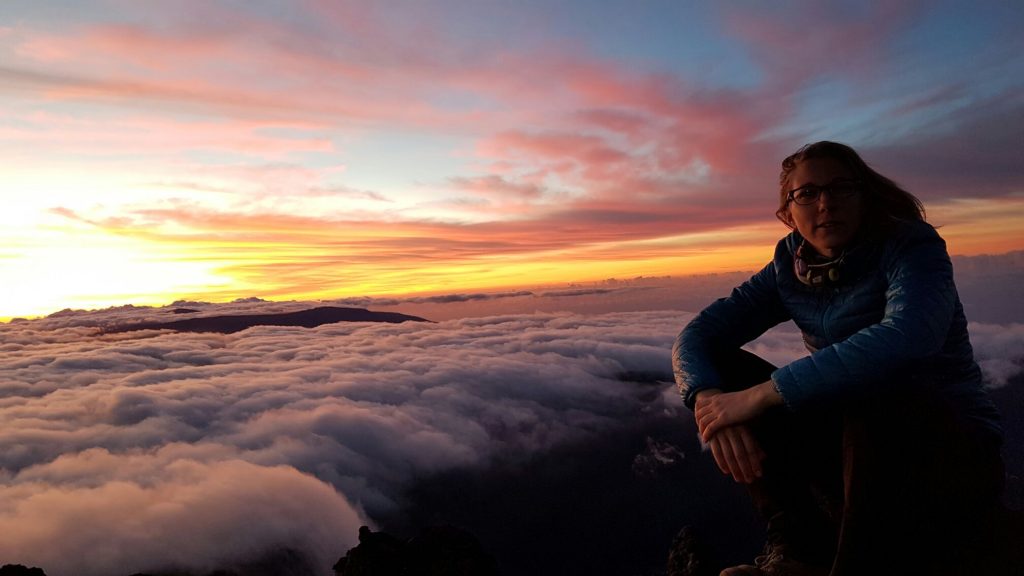 Au-dessus de moi, les étoiles bienveillantes, en moi, comme un mal de mer plus que de montagnes. Je ne sais pas comment mais j’avance, je m’efforce d’avancer, coûte que coûte, mes jambes me portent, me transportent, soulèvent ce grand corps. Seul résonne au cœur de la nuit le bruit strident des bâtons qui viennent se planter dans la caillasse. A chaque pas se brise le silence insulaire des montagnes endormies. Devant, derrière, les compagnons ne sont pas loin, les lumières dansantes donnent le repère, et le concert des bâtons le rythme. L’heure tourne. Nous avons rendez-vous avec le soleil, et le soleil n’attend pas. Les bâtons claquent de plus en plus vite contre la pierre. Ce matin, hors de question qu’il se lève sans nous. Hors de question qu’il nous devance. Toujours aussi nauséeux, nous parvenons enfin au sommet. Tout excités. Encore tout emmitouflés par la nuit. C’est bon de savoir que nous sommes en avance pour le spectacle du monde, c’est si bon de sentir monter en soi la joie pure de cet instant à venir…instant de l’éternel émerveillement, de l’éternel recommencement. Peu à peu la mer de nuages s’embrase jaune orangée rose rougeoyante. Ça y est, on y est, le soleil des neiges baille, s’étire, ouvre les yeux sur l’île Vanille, enfin nous salue à trois mille soixante dix mètres d’altitude… nos yeux s’empourprent de bonheur !